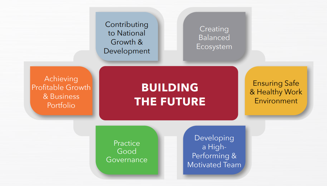 Our Sustainability Framework is based on seven key pillars which are centred around the core theme of “Building the Future”. These pillars provide the backbone for sustainable development within our organisation and were identified based on their significant impact on Qatar Steel’s sustainability performance and our stakeholders’ expectations. Each pillar is directly connected to the material issues that have been recognised as most critical to our company’s success and are associated with specific goals and KPIs.
